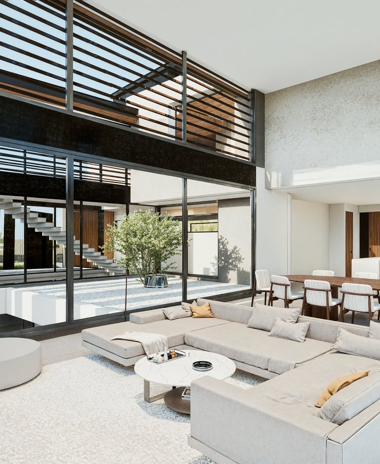 Esta vivienda combina líneas contemporáneas con una paleta de materiales cálidos que transmiten elegancia y confort. Los espacios se articulan de manera fluida, aprovechando al máximo la luz natural gracias a grandes aberturas y una cuidada orientación. El uso de la madera aporta calidez y textura, mientras que las superficies claras y los detalles minimalistas refuerzan la sensación de amplitud y serenidad.