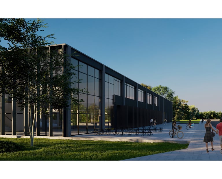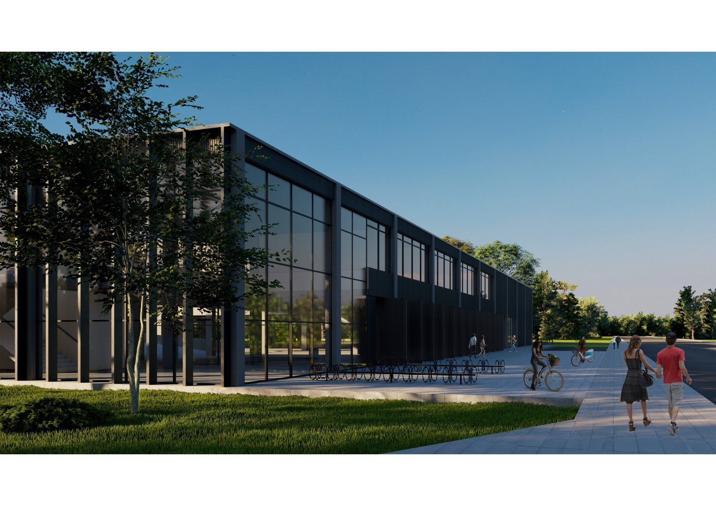 La estructura se expresa con un lenguaje vertical. Las fachadas noroeste y noreste tienen parasoles adicionales. El acceso está marcado por un gran vacío en el centro del edificio que invita a entrar.